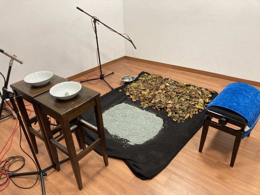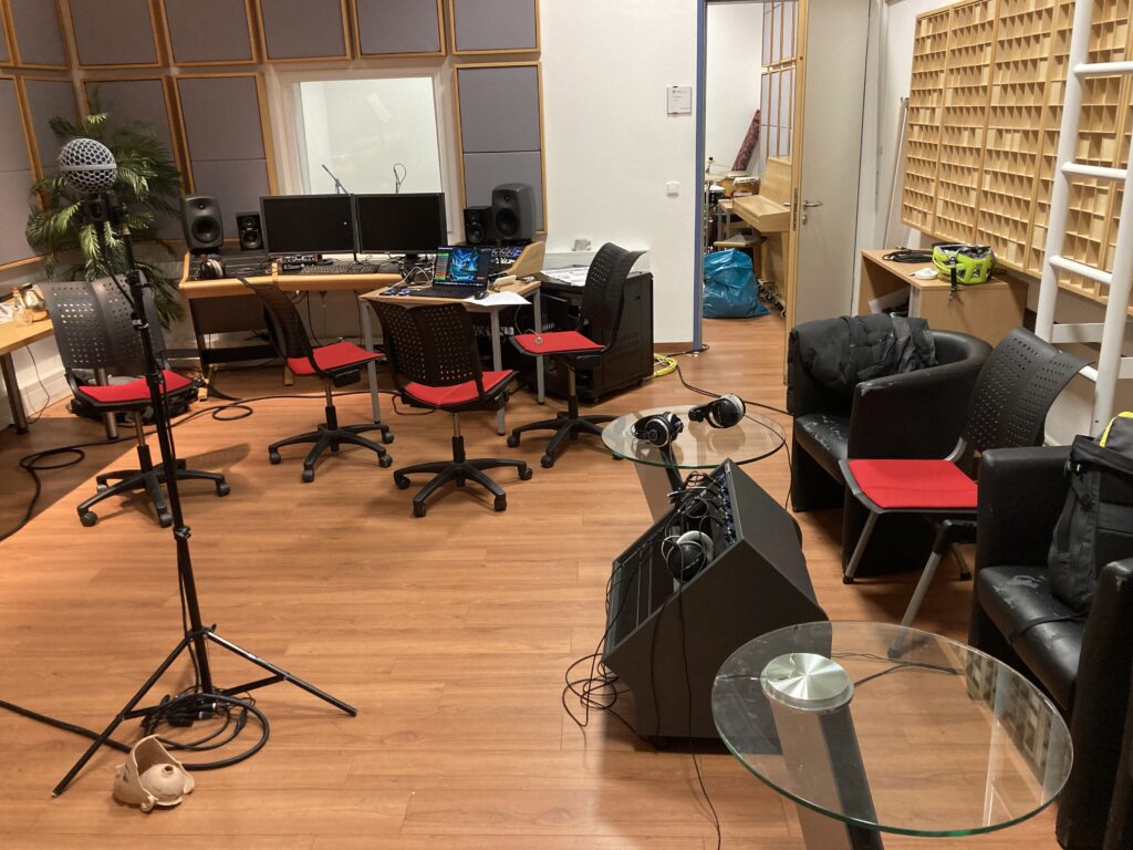 Im Aufnahmestudio-Raum war ein Foley-Setup aufgebaut mit einem mikrofonierten Spielfeld bestehend aus zwei Laufuntergründe für Schritte-Geräusche (trockene Blätter und Schotter) Wasserbehältern (am Boden und auf dem Tisch) und einer Sitzgelegenheit (mit einem Fußabtreter).