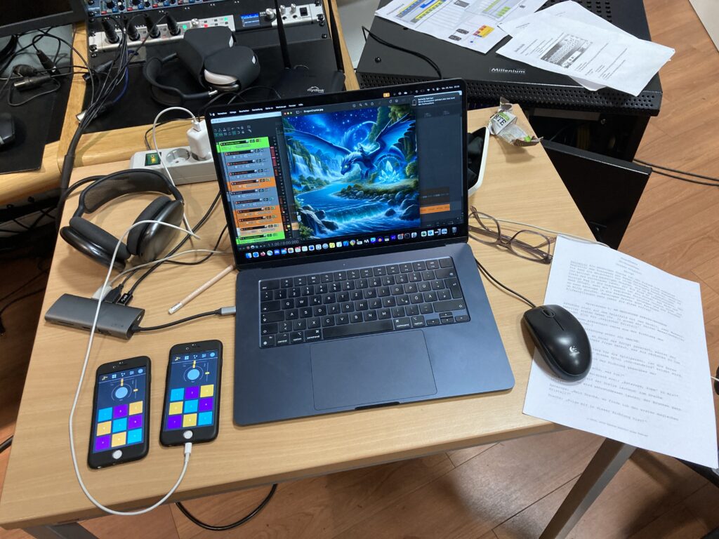 Die Foley-Mikrofone wurden in Reaper in einzelne Audiospuren kanalisiert, in denen für die Wasserbehälter-Mikrofone mittels Ambisonics-Encoder (IEM Plug-in Suite) die Anordnung der Wasserbehälter im Raum im 3D-Audiofeld positioniert und auf die Spieler*innen-Kopfhörer gesendet wurden.