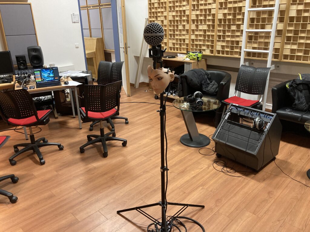 In der Tonregie war ein 3D Audio Ambisonics-Mikrofon (Røde NT-SF1 1st Order) über ein Audiointerface (Steinberg AXR4) mit der DAW Reaper verkabelt, in der mittels Ambisonics-Decoder (Røde Soundfield, IEM Plugin-Suite) das vierkanalige Audiosignal in Echtzeit in ein AmbiX B-Format und dann in ein binaurales Stereo-Signal decodiert wurde. Dieses 3D-Stereo-Signal wurde aus Reaper heraus über Bluetooth an einen bluetoothfähigen Headtracking-Kopfhörer gesendet (Apple AirPodMax). Die Headtracking-Daten des Kopfhörers (X,Y,Z Rotationsachsen) wurden über eine Software (Headitude) gesendet und von da aus über OSC in Reaper an ein 3D-Head-Rotation Plug-in (IEM Plug-in Suite).